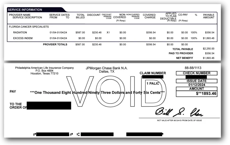 David's plan has $2,250 of coverage for radiation treatment, so his plan paid Florida Cancer Specialists their $356.54 and sent David a check for the remaining $1,893.46 (pictured)